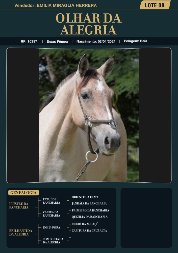 Olhar da Alegria Pai: Ilustre da RanchariaMãe: Brilhantina da AlegriaAvô materno: Orvalho do Nhú-Porã
