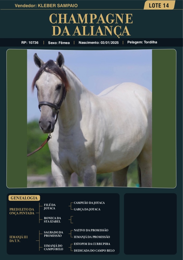 Champagne da Aliança Pai: Predileto da Onça PintadaMãe: Iemanjá III da T.N.Avô materno: Sagrado da Promissão
